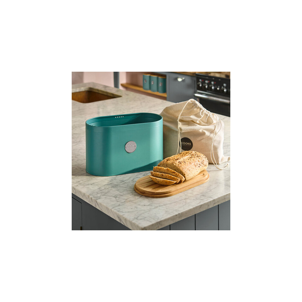 (Teal & Silver) Cooks Professional Ribbed Bread Bin with Linen Bag & 2-in-1 Bamboo Cutting Board Lid