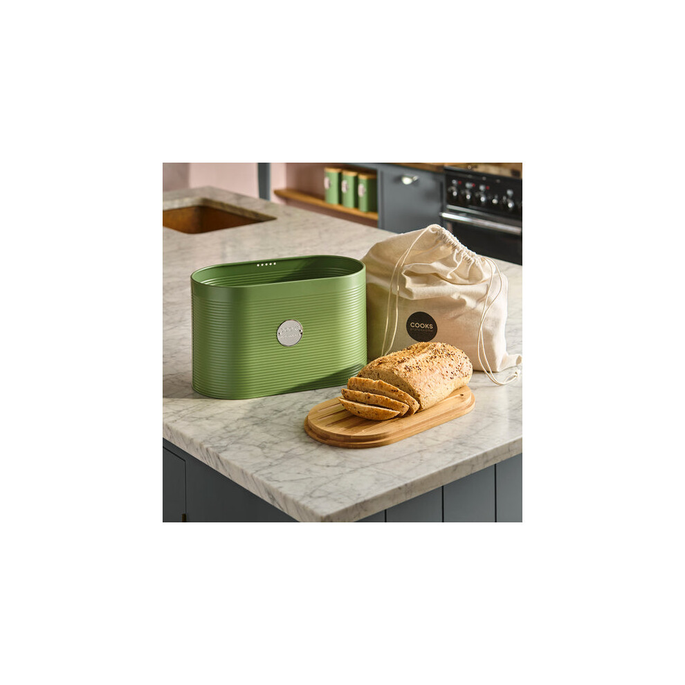 (Green & Silver) Cooks Professional Ribbed Bread Bin with Linen Bag & 2-in-1 Bamboo Cutting Board Lid