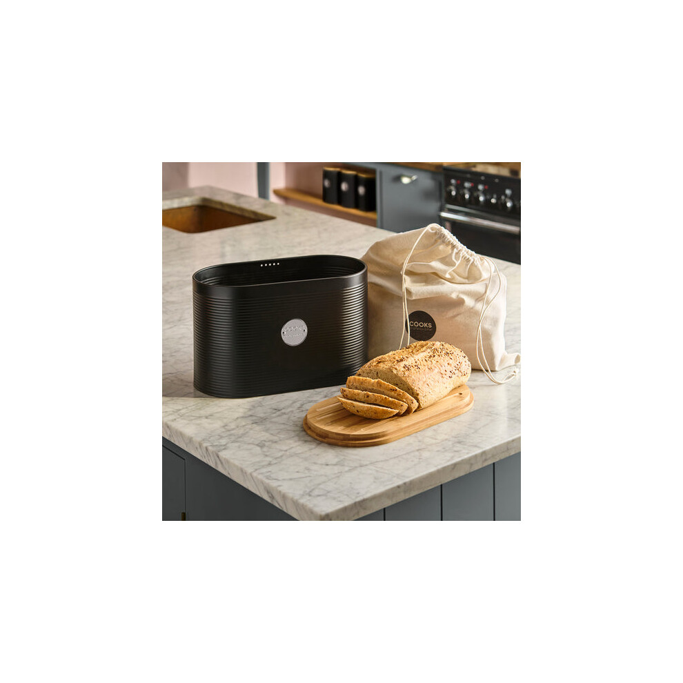 (Black & Silver) Cooks Professional Ribbed Bread Bin with Linen Bag & 2-in-1 Bamboo Cutting Board Lid