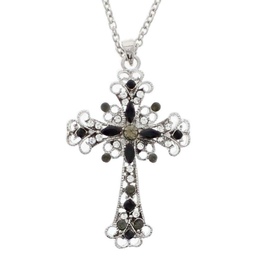Black Pearl & Diamante Stone Cross Necklace - Silver Chain for Women Crystal