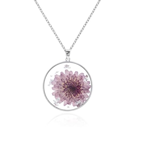 Weviway Pressed Purple Flower Circle Pendant Necklace, Silver Chain, Floral Jewellery for Women