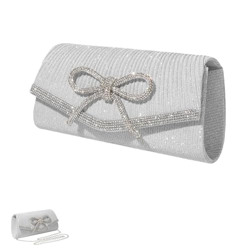 louuuou Silver Diamante Clutch Bag, Bow Bag Silver Clutch Bags Clutch Bags for Women Sparkling Rhinestone Bow Evening Women's Clutches With Detachable Chain Strap for Party Ladies