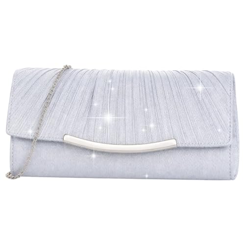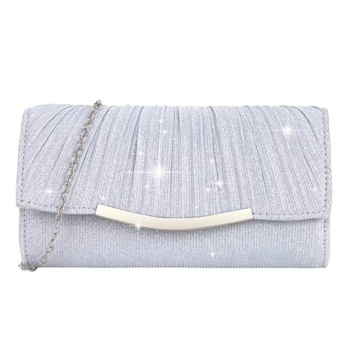 Larcenciel Glitter Women's Clutches, Silver Pleated Clutch Bag w/Detachable Chain, Elegant Evening Handbag, Fashion Ladies Crossbody Shoulder Bag for Wedding, Prom, Party, Dinner, 22x11x4.8cm