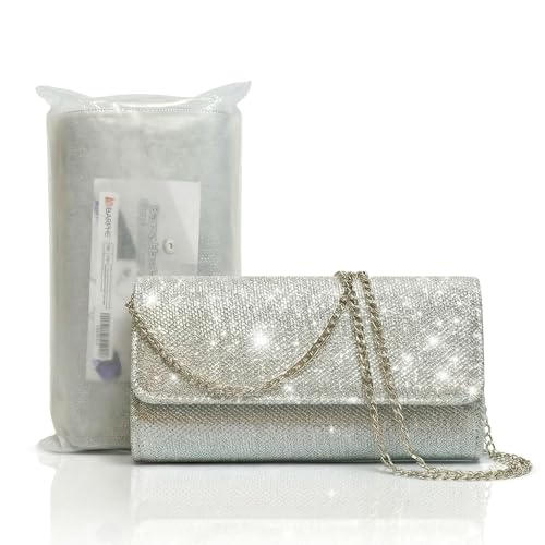 Barpre Handbags for Women: Elegant Silver Glitter Clutch Bag | Sequinned Envelope Evening Bag with Detachable Chain Strap | Ladies Clutch Bags for Wedding, Bridal, Prom & Cocktail Parties