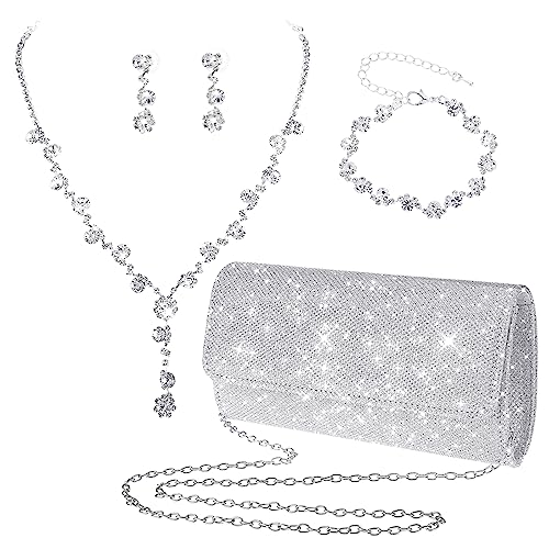 Yolev Bridal Wedding Jewelry Set - Silver Clutch Purse Bag - Rhinestone Necklace, Earrings, Bracelet - Prom Jewelry for Brides & Bridesmaids