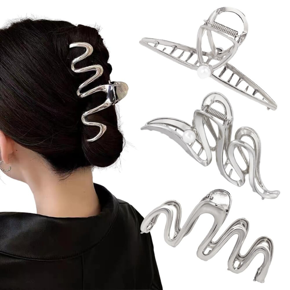 3 Pack Hair Claw Clips for Thick Long Hair Silver Metal Wave Cross with Peal Big Jaw Clamps Hair Accessories for Women Fashion Elegant Aesthetics Va