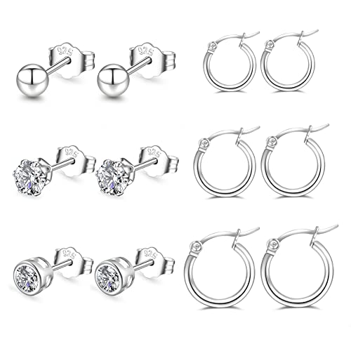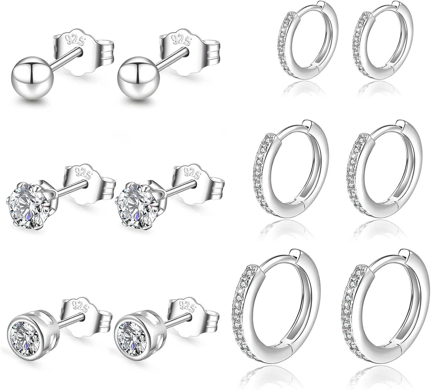 Hypoallergenic Sterling Silver Stud Hoops Earrings for Women - Studs Hoop Earrings Set Huggie Earring Stack Dainty Sterling Silver Earring Sets for Multiple Piercings with Gifts Box CZ