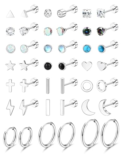 JeweBella 21Pairs Small Stud Earrings for Women Surgical Steel Flat Back Earrings Silver Cartilage Hoops Earrings Set Hypoallergenic Pearl Star Moon Zirconia Moonstone Piercing Earrings for Women Men
