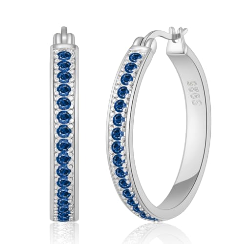 BMMYE Silver Hoops Earrings for Women Hypoallergenic Sparkly Blue Rhinestone Sterling Silver Hoop Earrings for Women 30mm Hoops