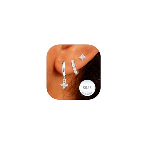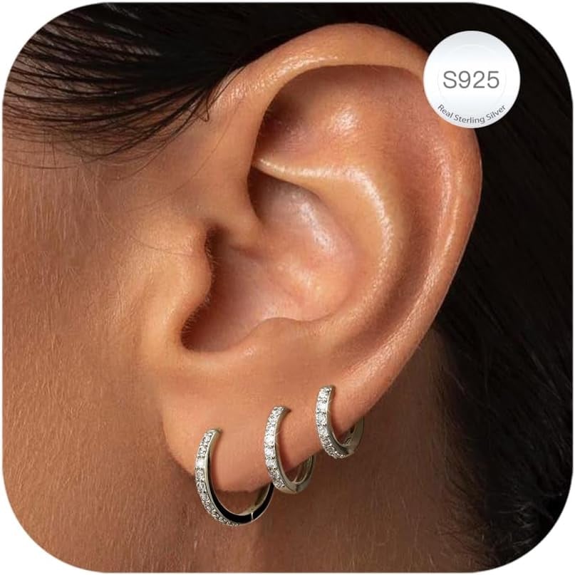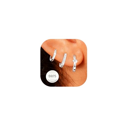Silver Hoops Earrings for Women S925 Sterling Silver Small Hoop Earrings with Cubic Zirconia Huggie Silver Sleeper Earring for Women Girls Jewelry Gift 3Pairs PABBEU