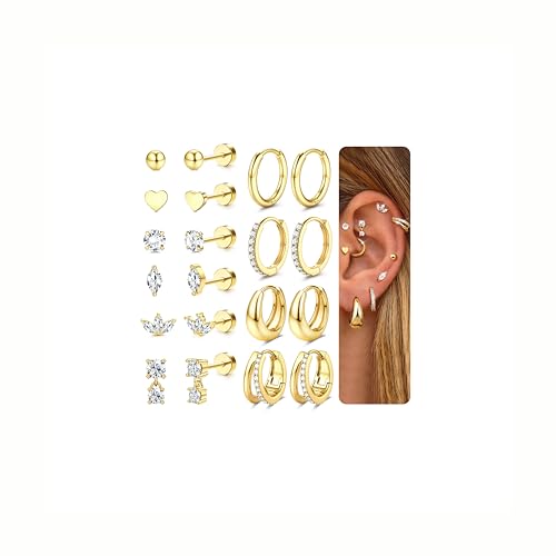 Diamday 12 Pairs Earrings for Women Surgical Steel Flat Back Earrings Hoop Earrings Set 14K Gold Helix Tragus Cartilage Stud Earrings Silver Huggies Hoops Studs Hypoallergenic for Multiple Piercings C