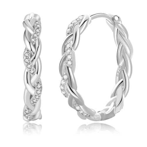 PABBEU Sterling Silver Hoop Earrings,Hypoallergenic Twisted Silver Hoops Earrings for Women Lightweight Silver Hoop Earrings with Cubic Zirconia Hoops 20MM