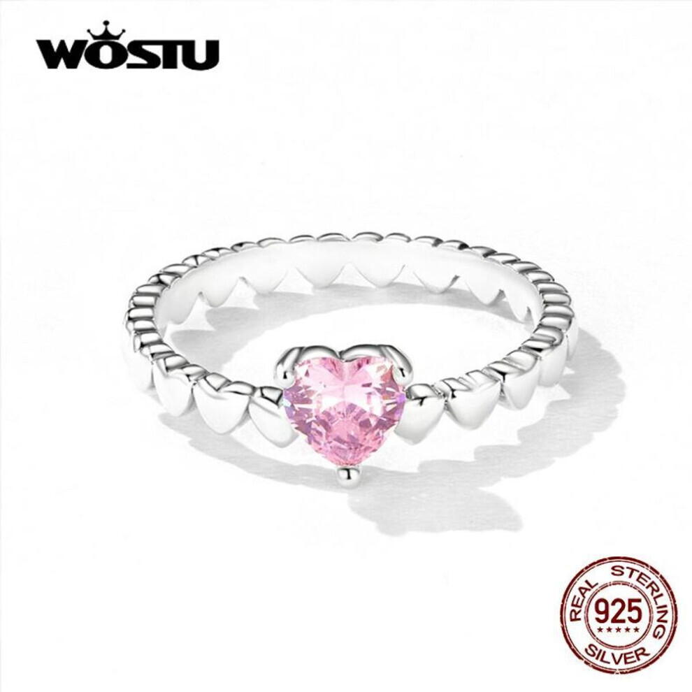 (6) Wostu Delicate Heart Silver Ring Genuine 925 Sterling Silver Pink Zircon Love Rings For Women Fine Jewelry Gift