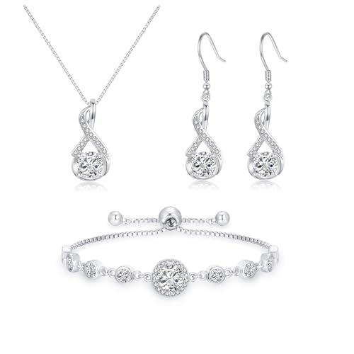 Cangall Women’s Jewellery Sets, 925 Sterling Silver 3PCS Fashion Necklace Bracelet and Earrings Set with White Cubic Zircon, Infinity Silver Jewellery Set for Wedding Prom Anniversary Birthday Gifts