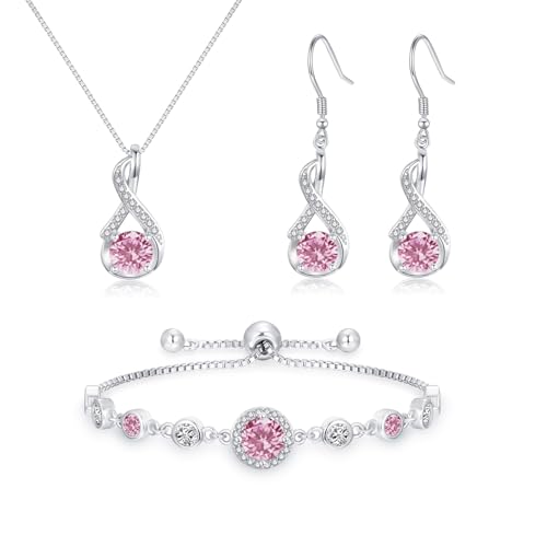 Cangall Women’s Jewellery Sets, 925 Sterling Silver 3PCS Fashion Necklace Bracelet and Earrings Set with Pink Cubic Zircon, Infinity Silver Jewellery Set Pink for Wedding Prom Anniversary Birthday