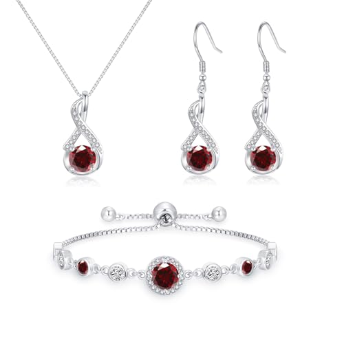 Cangall Women’s Jewellery Sets, 925 Sterling Silver 3PCS Fashion Necklace Bracelet and Earrings Set with Red Cubic Zircon, Infinity Silver Jewellery Set Red for Wedding Prom Anniversary Birthday