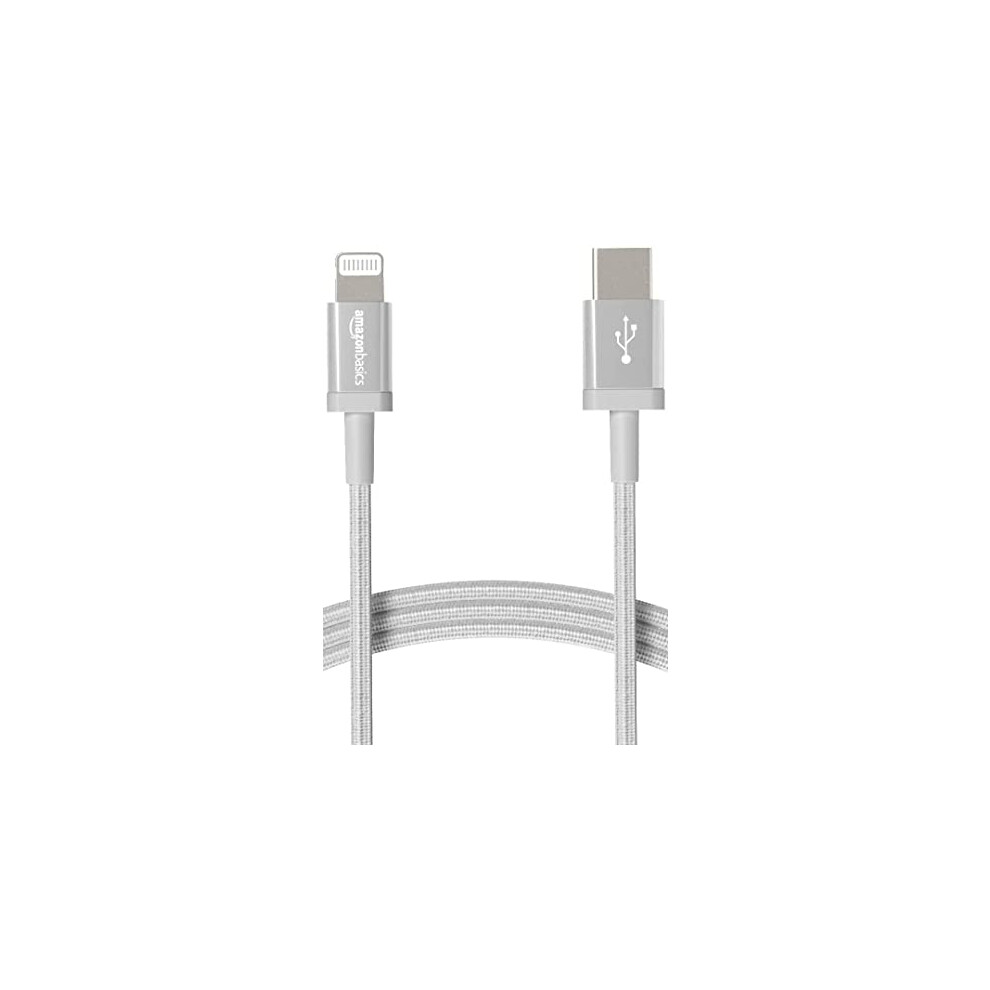 Amazon Basics USB-A to Lightning Charger Cable, Nylon Braided Cord, MFi Certified Charger for Apple iPhone 14 13 12 11 X Xs Pro, Pro Max, Plus, iPad, 1.8 m, Silver