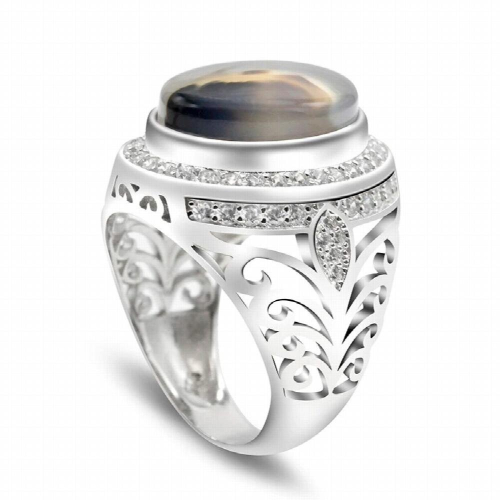 Oval Natural Agate Stone 925 Sterling Silver Mens Ring Hollow Mens Gemstone Jewelry Ring Gift