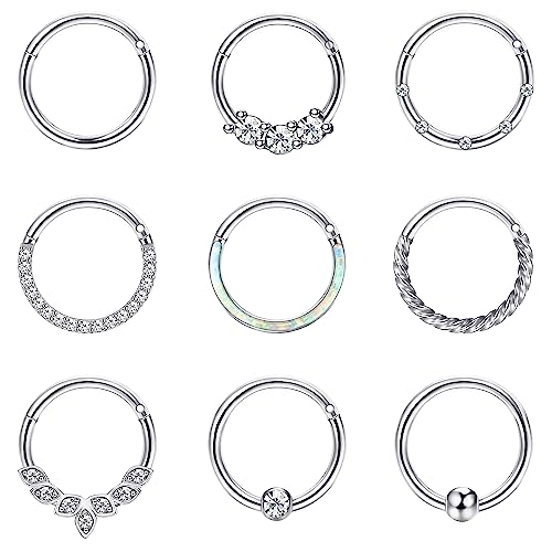JeweBella 9PCS 16G Nose Ring Surgical Steel for Women Hinged Septum Ring CZ Opal Cartilage Hoop Earrings Tragus Helix Piercing Silver Lip Nose Rings Daith Jewellery 8/10mm