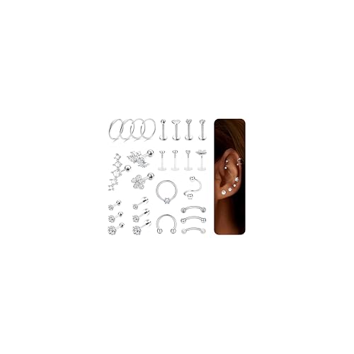 LOLIAS 27Pcs Helix Piercing Jewellery Surgical Steel Tragus Earring Helix Stud Hoop Cartilage Earrings Silver Conch Daith Rook Tragus Piercing Jewellery for Ear Nose Lip Eyebrow Labret