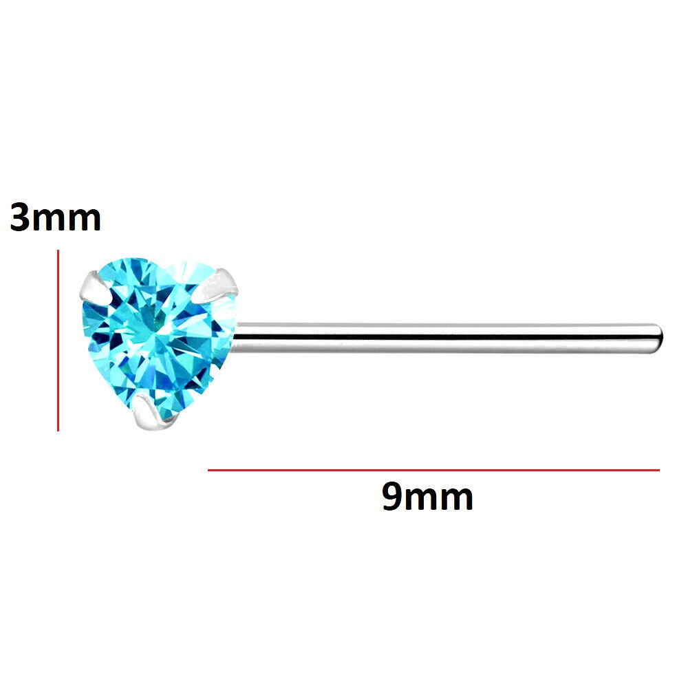 925 Sterling Silver Nose Stud 3mm Aqua Light Blue CZ Heart straight pin bend2fit