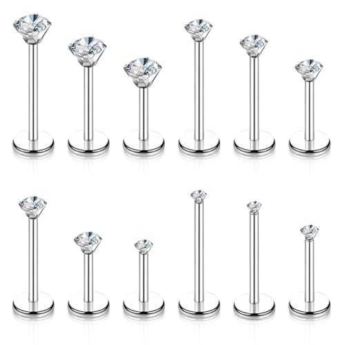 Telooco 12Pcs Silver Flat Back Nose Stud 16G Stainless Steel Push Pin Labret Studs Cubic Zirconia Threadless Flat Back Earring Lip Bar Medusa Tragus Piercing Jewellery for Women Men 6/8/10/12mm