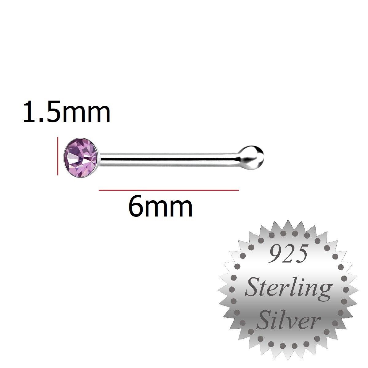 1.5mm Lavender Crystal Sterling Silver Nose Stud short ball end Pin Light Purple