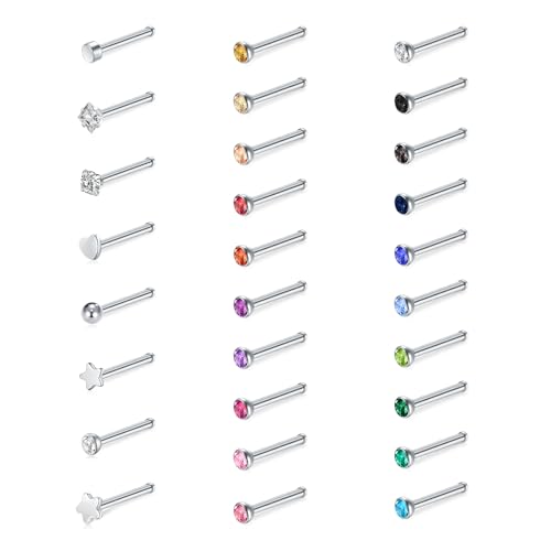 WillTen 30Pcs Straight Nose Studs Silver, 20G Nose Ring Stud Straight or L Shaped Stainless Steel Small Nose Studs Pin, Tiny Nose Piercing Jewelry Silver Bone Screws Nose Stud for Women