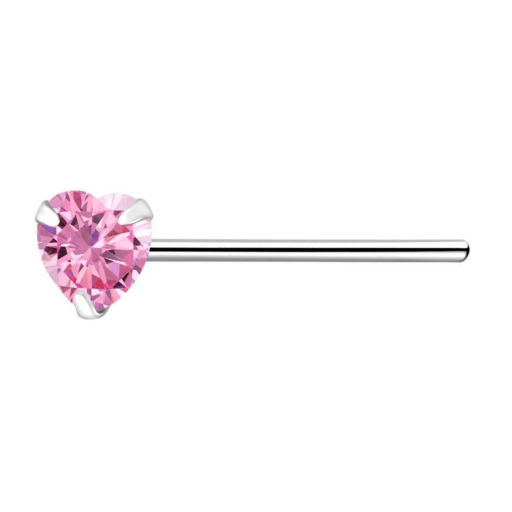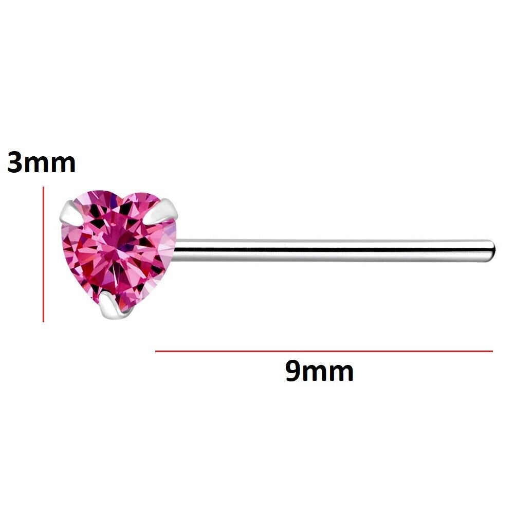 925 Sterling Silver Nose Stud 3mm Pink CZ Heart straight pin bend to fit ring UK