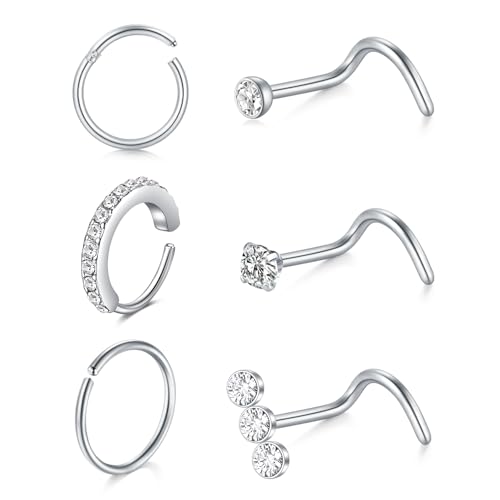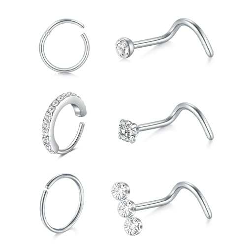 LAURITAMI 20G Silver Nose Stud,Stainless Steel Hinged 8mm Nose Rings Hoop Screw Shaped Studs with CZ Piercing Jewellery Set for Women Men,Pack of 6 Pieces
