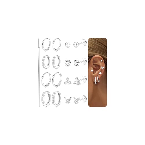 Diamday 8 Pairs Helix Piercing Jewellery Surgical Steel Tragus Piercings Flat Back Earrings for Women Hypoallergenic Cartilage Earrings Hoops Silver Labret Nose Stud Daith Conch Tragus Piercing A