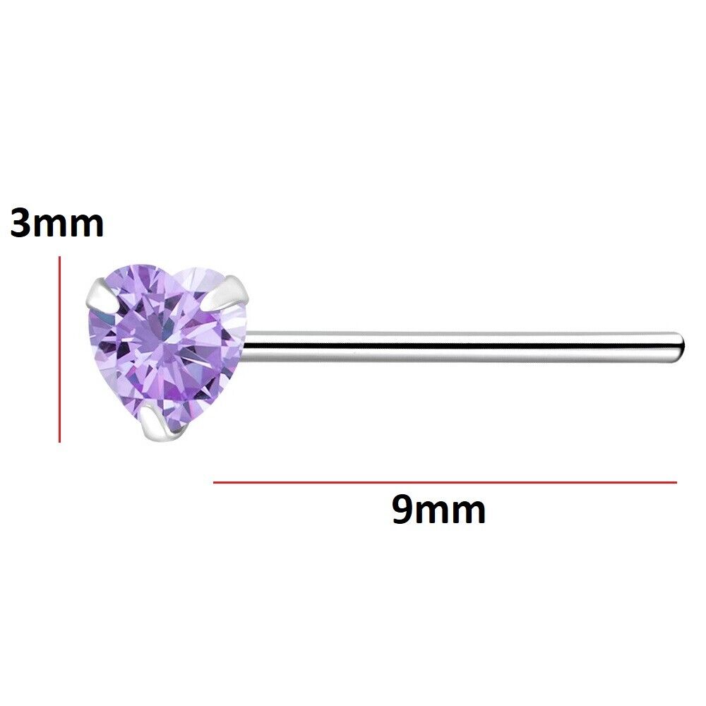 925 Sterling Silver Nose Stud 3mm Lavender Purple CZ Heart straight pin ring UK