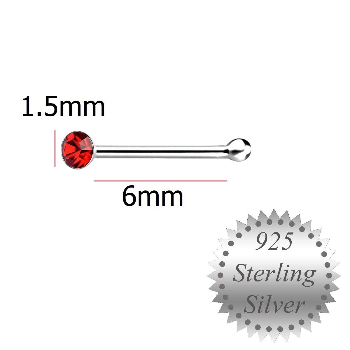 1.5mm Red Crystal Sterling Silver Nose Stud short ball end Pin Bone Siam UK