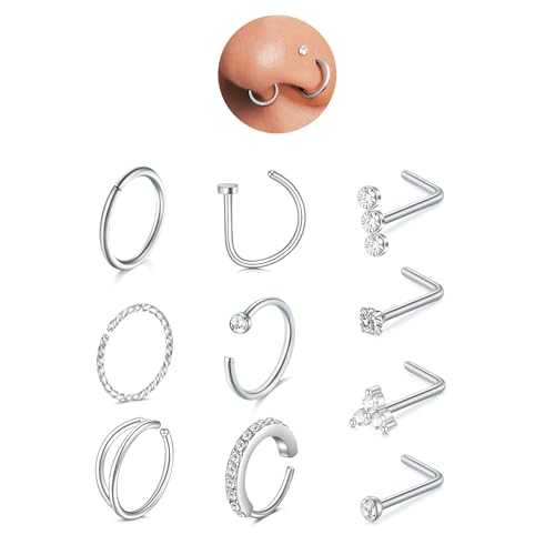 sawyofu Silver Nose Ring Stud Hoops 20g 10pcs Titanium Thin Double Nose Septum Ring Hypoallergenic Corkscrew L Shape Lip Helix Septum Nose Piercing Jewellery For Women Men