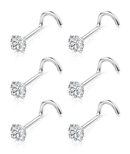 Chriscoco 6Pcs G23 Titanium Nose Studs Screw Nose Piercing Jewellery 3mm Clear CZ Nostrial Piercing Silver Nose Stud for Women Girls Men 20G