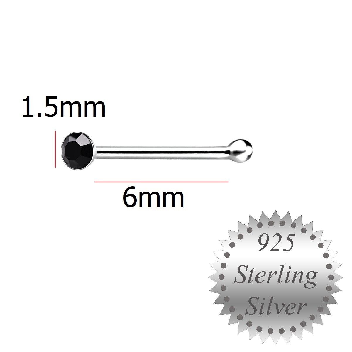 1.5mm Black Crystal Sterling Silver Nose Stud short ball end Pin Bone Gothic UK