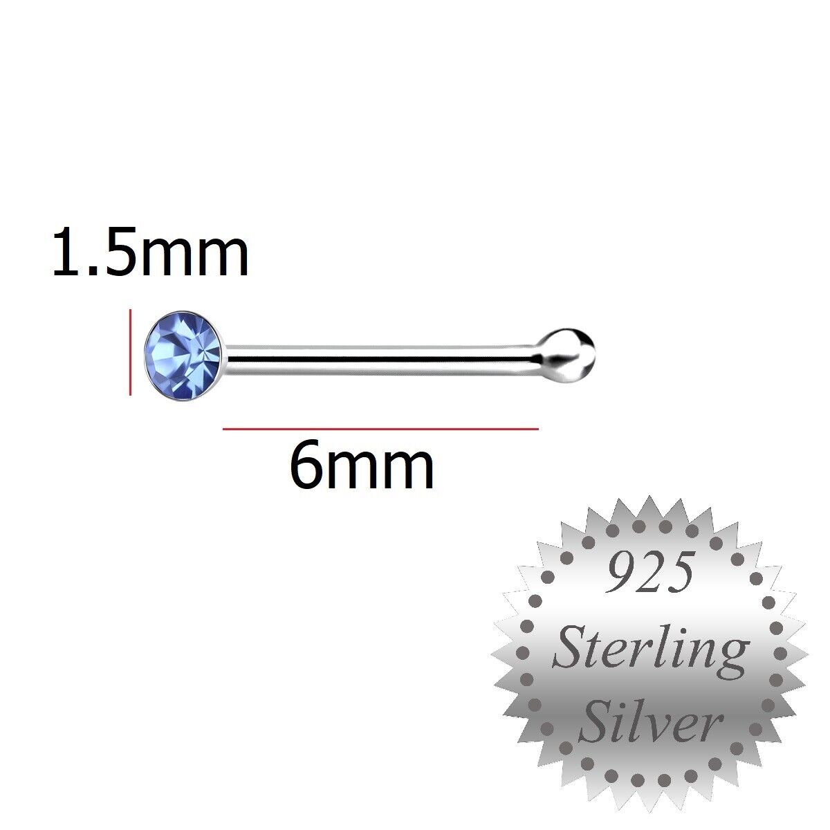 1.5mm Light Blue Crystal Sterling Silver Nose Stud short ball end Pin Bone UK
