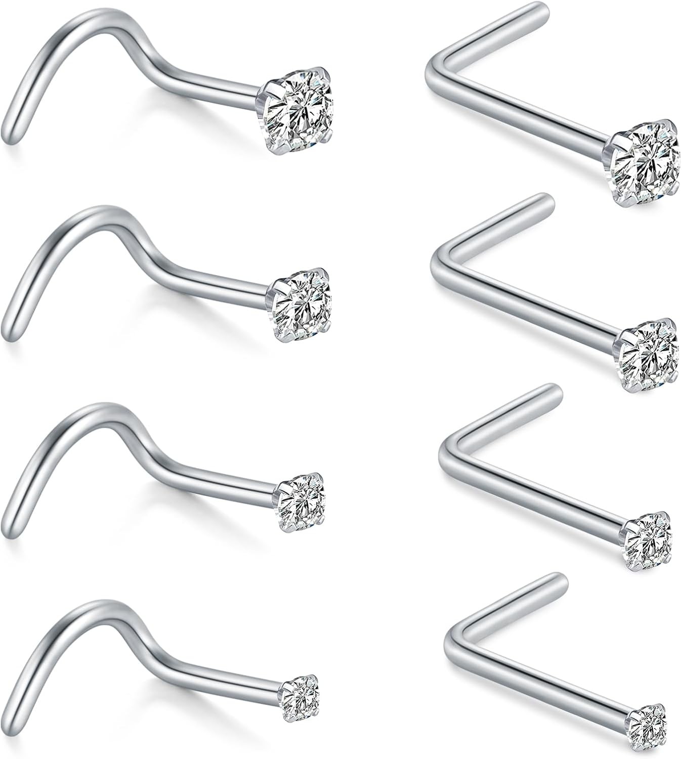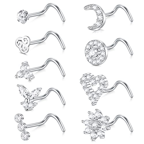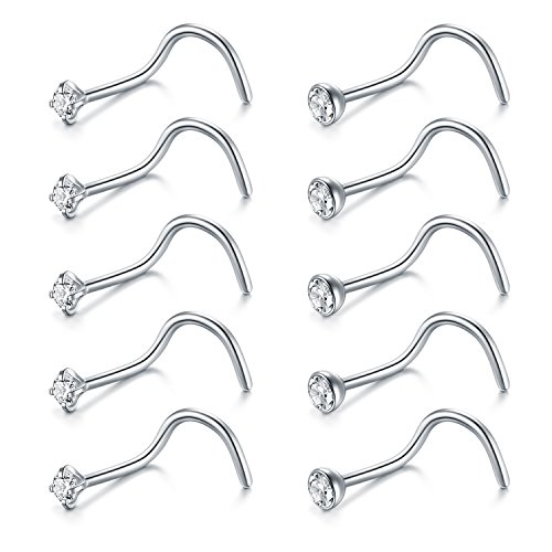 FECTAS 10pcs Nose Ring Screw Nose Stud 18G Corkscrew Nose Piercing Jewellery Stainless Steel 2mm Diamond Silver Nostril Piercing Jewellery