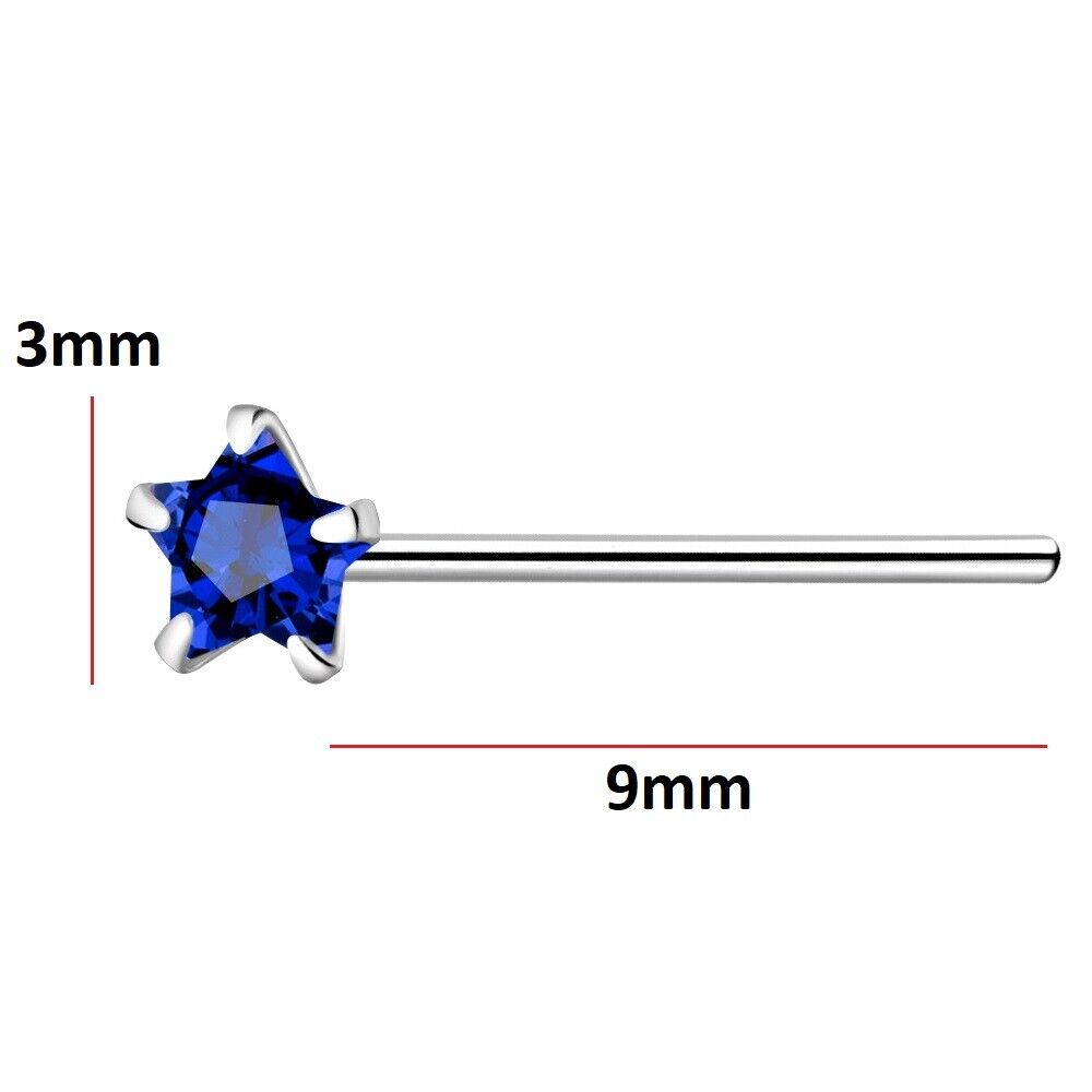 UK 925 Sterling Silver Nose Stud 3mm Sapphire Blue CZ Star straight bend to fit