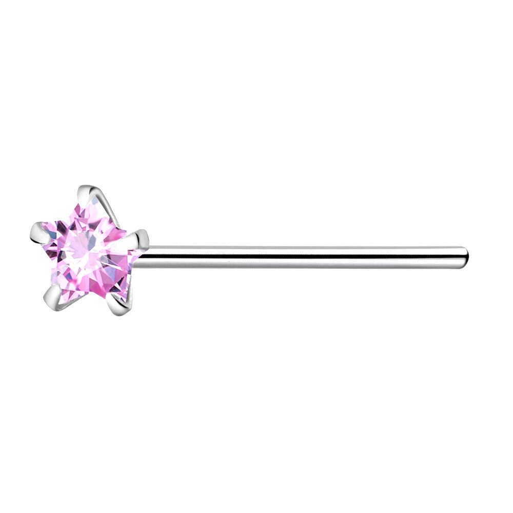 925 Sterling Silver Nose Stud 3mm Pink CZ Star straight pin bend to fit ring UK