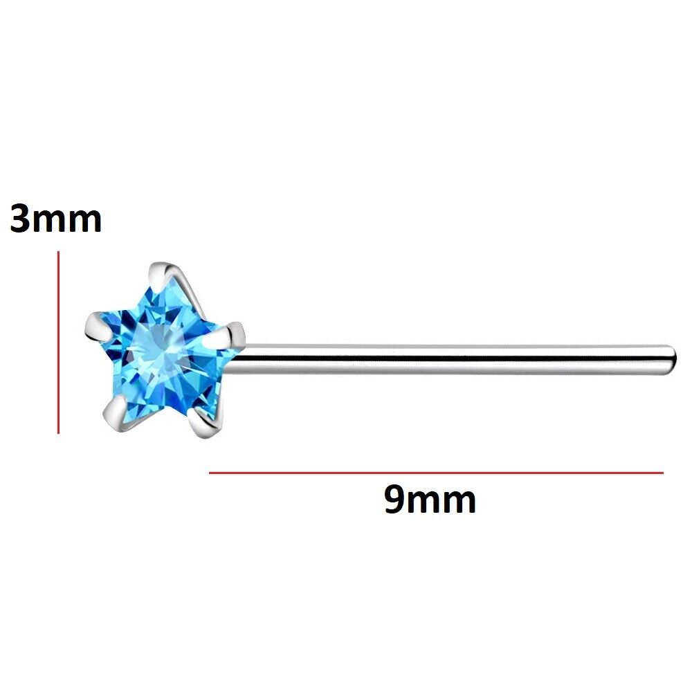 925 Sterling Silver Nose Stud 3mm Aqua Light Blue CZ Star straight bend 2 fit UK