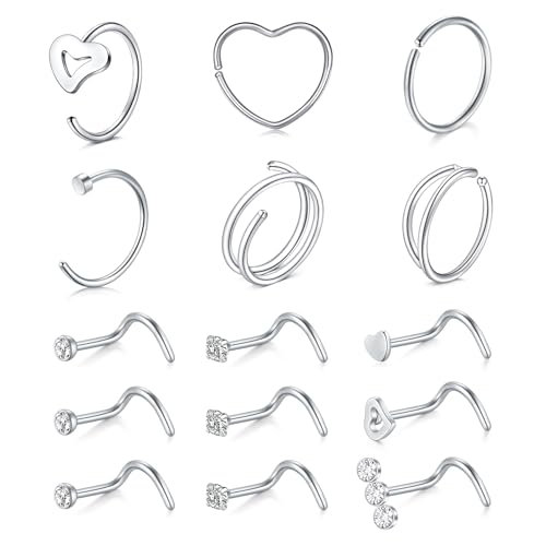 MODRSA 20G Silver Nose Stud Screw Nose Ring Hoop Women Stainless Steel Corkscrew Nose Studs Heart Nose Hoop Rings Nostril Piercing Jewellery 15PCS