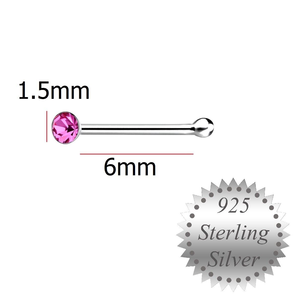 1.5mm Pink Crystal Sterling Silver Nose Stud short ball end Pin Bone Rose UK