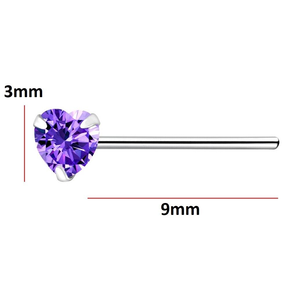 925 Sterling Silver Nose Stud 3mm Amethyst Purple CZ Heart straight pin ring UK