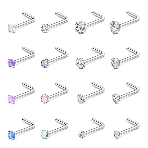 Finrezio 16 Pcs 18/20G Nose Studs L Shaped Nose Piercing for Women Silver Nose Stud Colorful Diamond CZ Stainless Steel Piercing Jewellery 1.5/2/2.5/3MM
