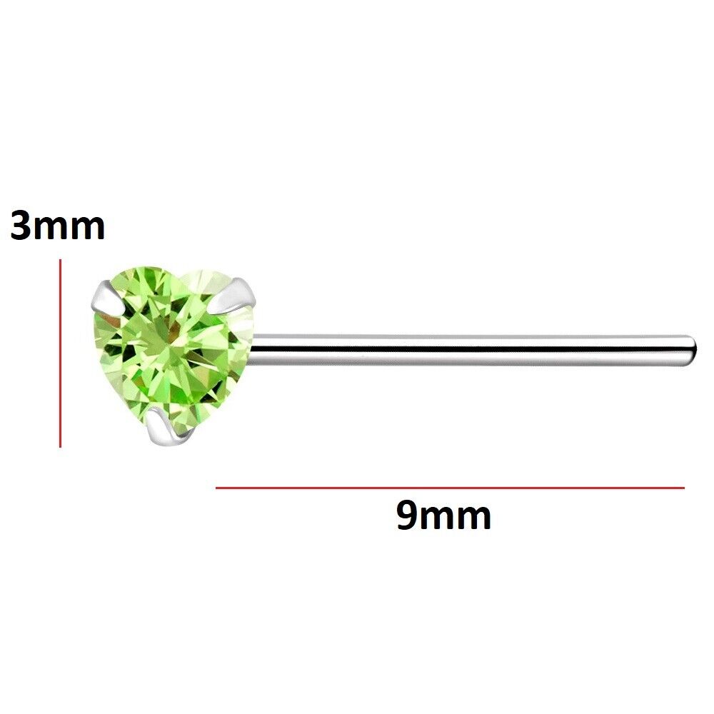 925 Sterling Silver Nose Stud 3mm Peridot Green CZ Heart straight pin bend 2 fit