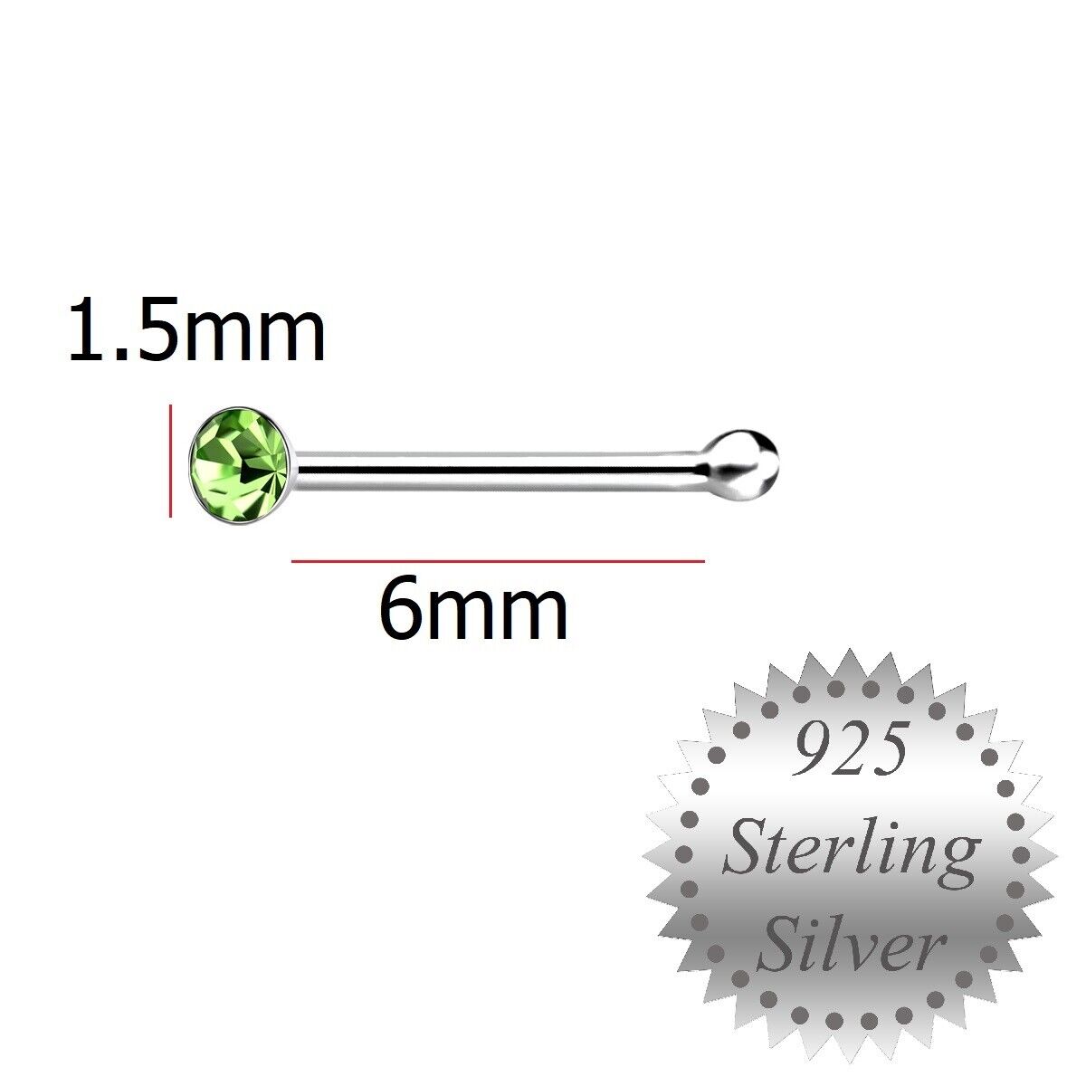 1.5mm Light Green Crystal Sterling Silver Nose Stud short ball end Pin Peridot