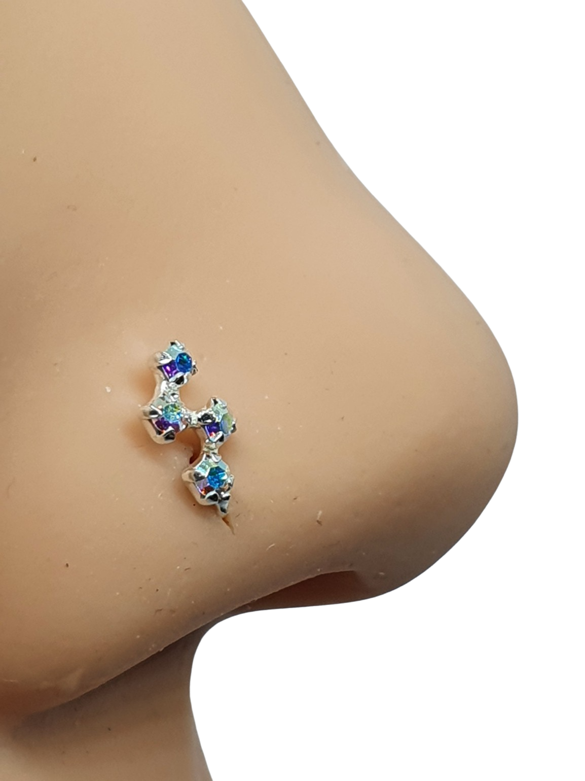Zig Zag Nose Stud 8mm 4 x AB CZ Gemstone 22g (0.6mm) 925 Silver Curl Nose Stud