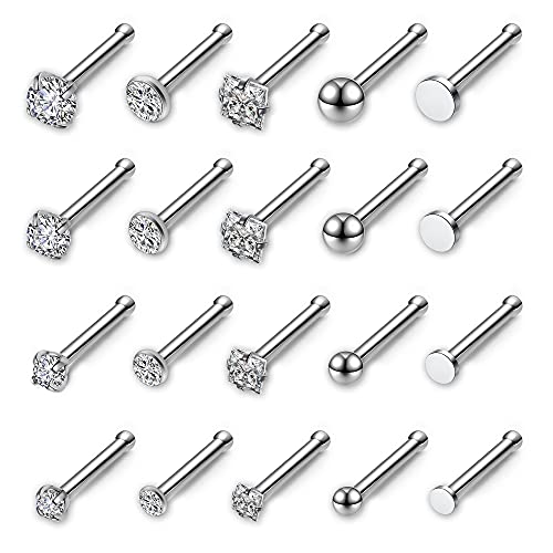 AllerPierce 20G 20Pcs Nose Studs Rings Stainless Steel CZ Silver Bone Stud Nose Piercing Jewelry for Women Men Hypoallergenic Nose Straight Pin 1.5mm 2mm 2.5mm 3mm