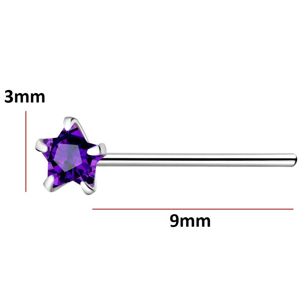 925 Sterling Silver Nose Stud 3mm Amethyst Purple CZ Star straight bend 2 fit UK